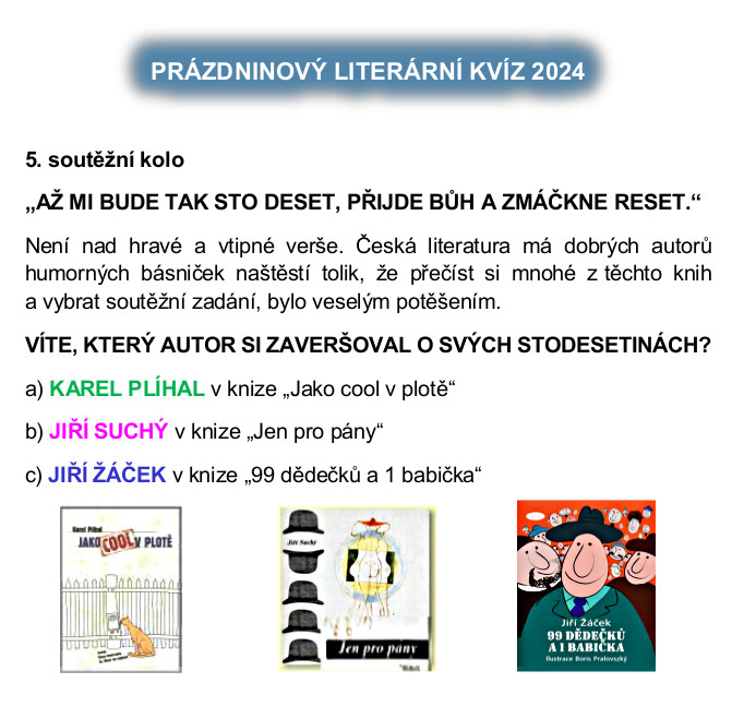 Na Vaše odpovědi se těšíme na e-mailu knihovna@velvary.cz, nebo na tel. 315761312. Hodně štěstí.