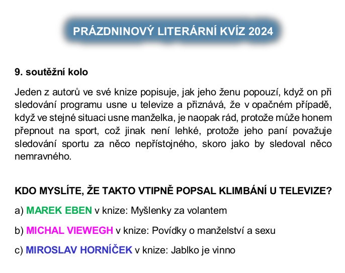 Na Vaše odpovědi se těšíme na emailu knihovna@velvary.cz, nebo na tel. 315761312. Hodně štěstí.
