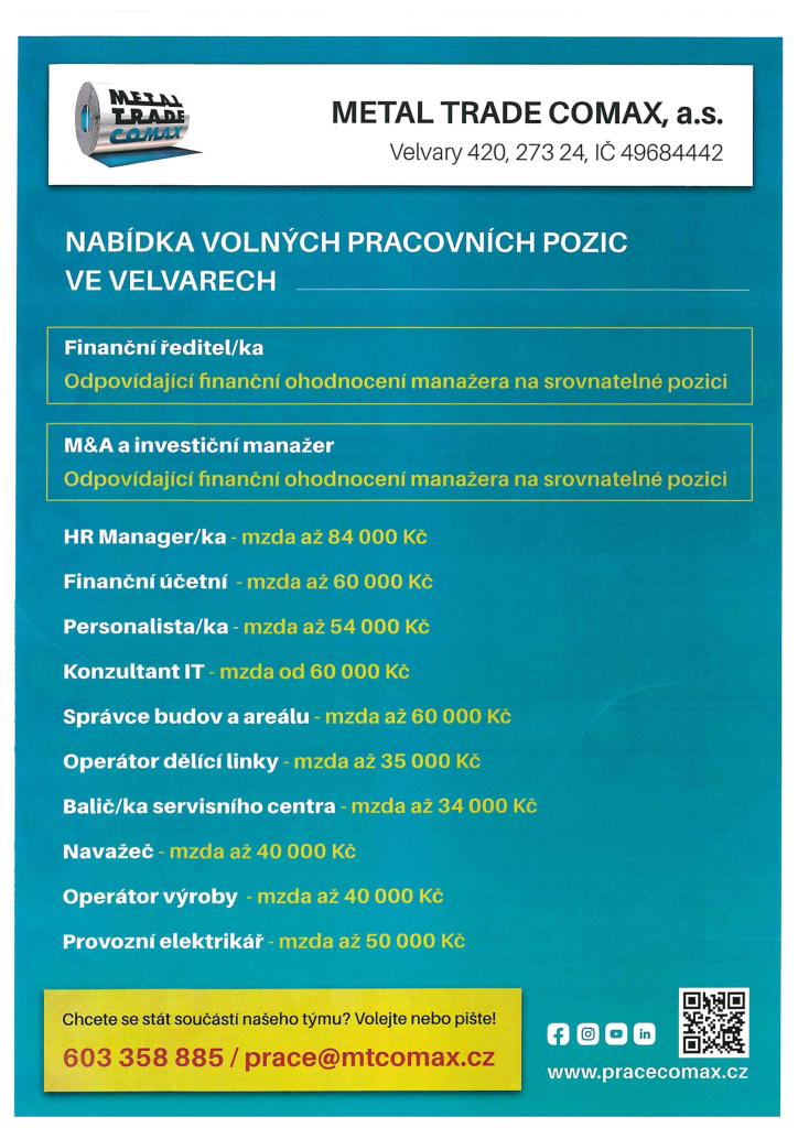 Společnost Metal Trade Comax, a. s. nabízí volná pracovní místa