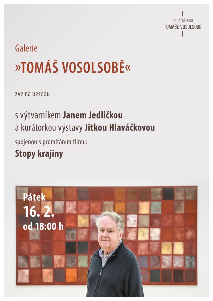 V pátek 16.2.2024 od 18 hodin Vás zveme do Galerie Tomáše Vosolsobě na besedu s výtvarníkem Janem Jedličkou a kurátorkou výstavy Jitkou Hlaváčkovou spojenou, beseda bude spojena s promítáním filmu STOPY KRAJINY.