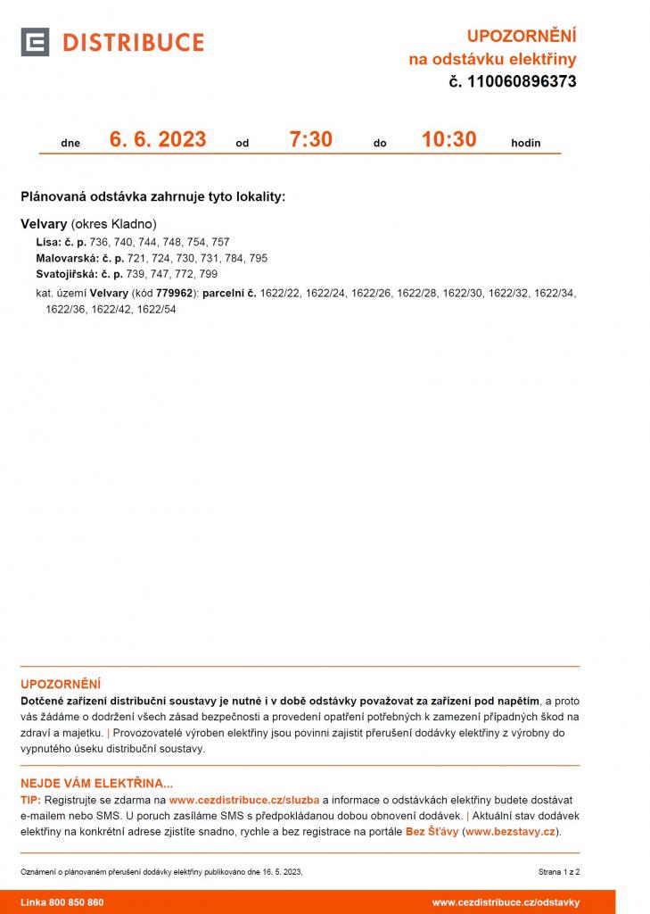Jménem ČEZ Distribuce si dovolujeme upozornit na plánované přerušení dodávky elektřiny 6. 6. 2023