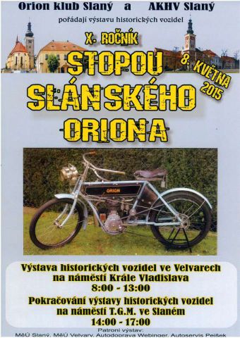 Orion klub Slaný pořádá v pátek 8.května 2015 jubilejní desátý ročník Stopou Slánského Oriona. Zúčastnit se mohou pouze vozidla a motocykly s rokem výroby do roku 1980.