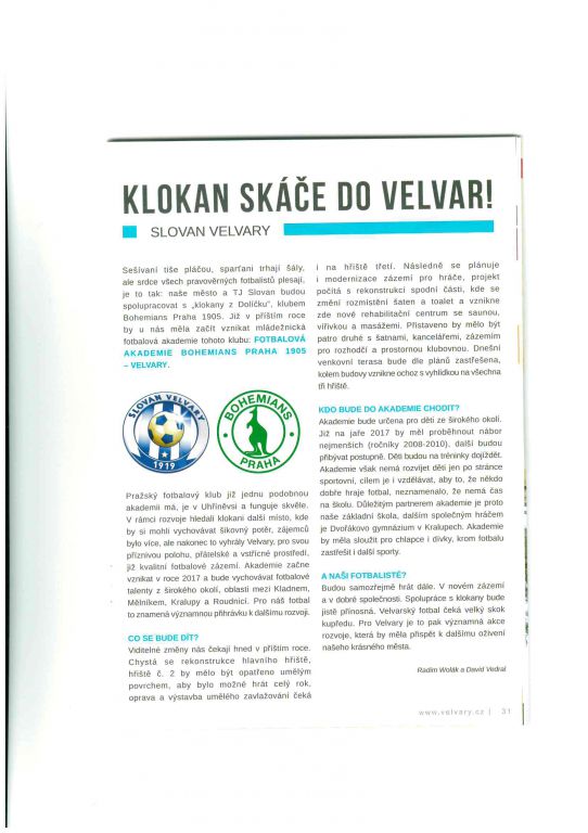 Fotbalisté mají nyní zimní přestávku, ale v klubu to určitě zdravě vře! Občané se rovněž ptají na novinky kolem zamýšleného vzniku fotbalové akademie Bohemians Praha 1905 - Velvary. Na zasedání zastupitelstva města dne 19.prosince t.r. se dostavili zástupci pražského klubu Ing. Jakubowicz a Mgr.Dobeš a představili přítomným projekt akademie.