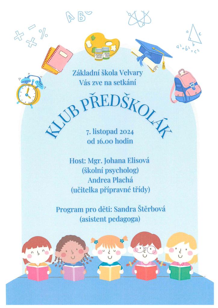 Základní škola Velvary Vás zve na setkání KLUBU PŘEDŠKOLÁK 7.11.2024 od 16 hodin.