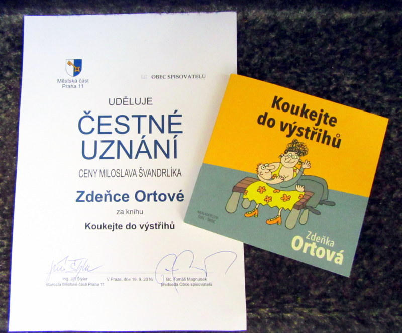 Do finále letošního ročníku se dostala mezi tři nejlepší humoristické knihy i knížka fejetonů velvarské spisovatelky Zdeňky Ortové „Koukejte do výstřihů a bylo jí uděleno Čestné uznání. Předávání cen uváděl Radim Uzel, v průběhu večera recitoval a zpíval Jan Vodňanský a ceny předal předseda Obce spisovatelů režisér Tomáš Magnusek. Blahopřejeme ! (ls)
