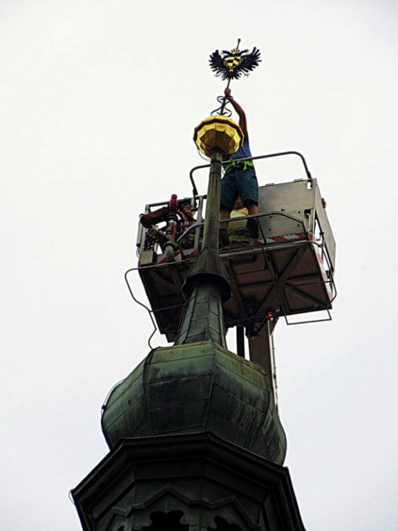 Nakonec se nosná tyč narovnala, nově vyklínovala a kopule se utěsnila proti zatékání vody. Věříme, že korouhev zase nějakou chvíli vydrží rovná a s naším městem "to nebude nahnuté". (ls)