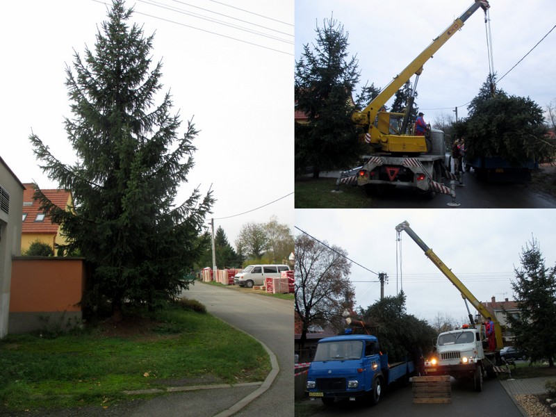 Strom darovali manželé Černých z Velvar a bylo nutné strom porazit a přepravit z ulice Nábřeží na náměstí. Dárcům moc děkujeme, stejně jako firmě Elektromontáže Kalců z Uhů za tradiční zapůjčení automobilového jeřábu. O přepravu se postarali také tradičně velvarští hasiči, stavbu a zdobení má na starosti městská technická četa. Pěkný smrk stojí již na svém místě a čeká na ozdobení.
