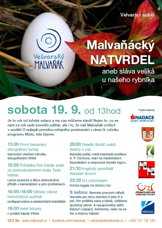 Zveme všechny velvarské i přespolní na bohatý program u Malovasrkého rybníka! V sobotu 19.září od 13 hodin se v areálu Malvaňáku koná akce "Malvaňácký NATVRDEL aneb sláva veliká u našeho rybníka". Program na přiloženém plakátku.