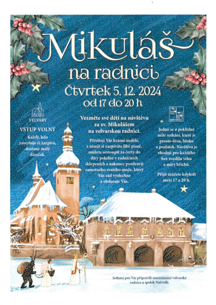 Ve čtvrtek 5.12.2024 od 17 do 20 hodin vezměte své děti na návštěvu za sv. Mikulášem na velvarskou radnici. Vstup volný. Každý kdo zaveršuje či zazpívá, dostane malý dáreček.