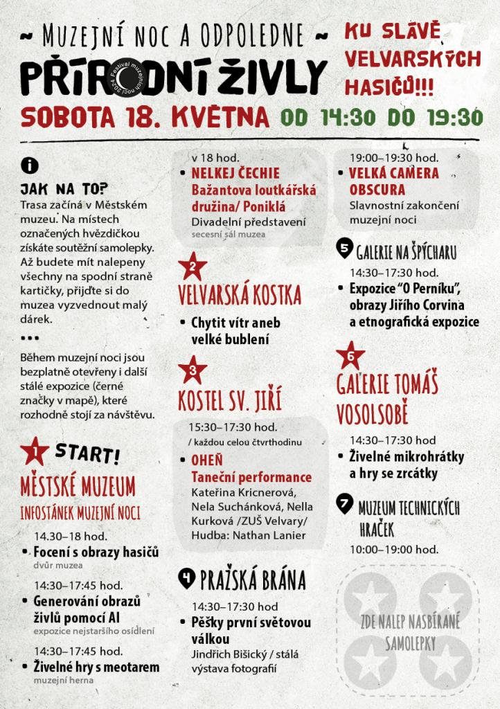 Program muzejní noci a odpoledne s interaktivními stanovišti proběhl v prostorách Městského muzea Velvary, ve Velvarské kostce a v Galerii Tomáš Vosolsobě , v sále muzea se večer hrálo divadlo, na dvoře se děti i dospělí fotili s obrazy hasičů před před bývalou hasičskou zbrojnicí, v kostele sv. Jiří tancovaly s plným nasazením dívky ze ZUŠ Velvary a program uzavřela Camera obscura v Pražské bráně. Během akce mohly účastníci navštívit bezplatně všechny stálé expozice Městského muzea i Muzeum technických hraček.