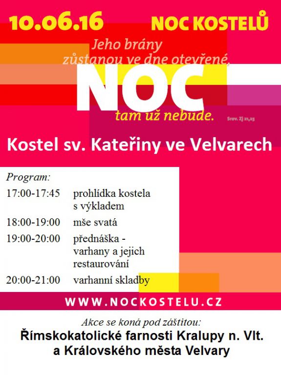Římskokatolická farnost Kralupy n/Vltavou a město Velvary  Vás zvou v pátek 10.června 2016 v 17 hodin do kostela sv.Kateřiny ve Velvary  na "Noc kostelů" - viz přiložený plakátek. (ls)