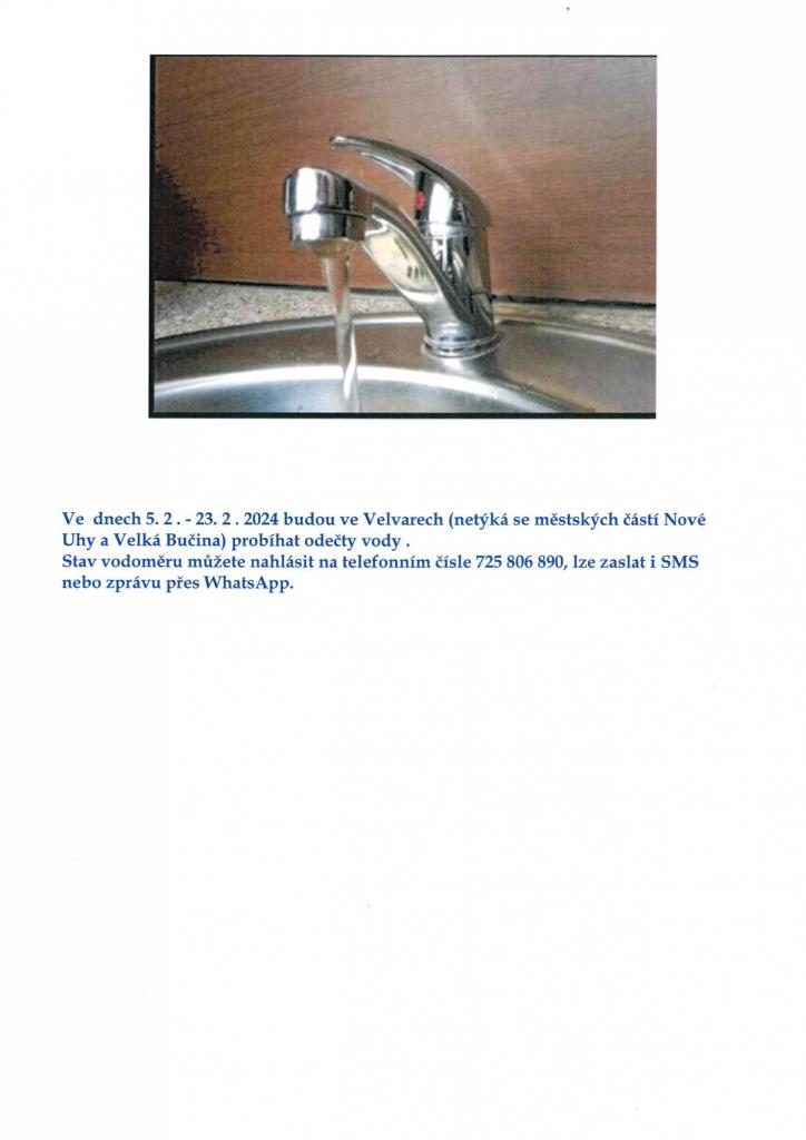 Ve dnech 5.-23.2.2024 budou ve Velvarech (netýká se částí Nové Uhy a Velká Bučina) probíhat odečty vody. Stav vodoměru můžete nahlásit na telefonním číle 725 806 890 (lze zaslat SMS nebo zprávu přes Whats App).