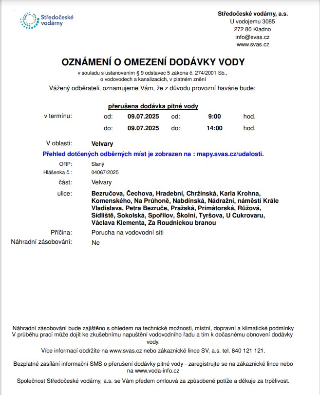 OMEZENÍ DODÁVKY VODY 9.7.2025 OD 9 DO 14 HODIN