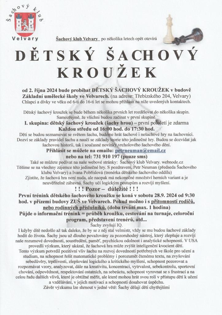Šachový klub Velvary po několika letech otvírá opět dětský šachový kroužek.