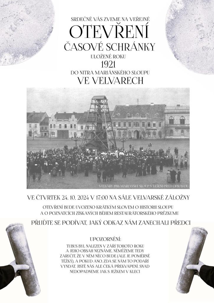 Ve čtvrtek 24. 10. v 17 hodin na Záložně otevřeme 100 let starý tubus, který nám zanechali předci v nitru mariánského sloupu a který byl nalezen při restaurátorském průzkumu. Přijďte se podívat, co je uvnitř!