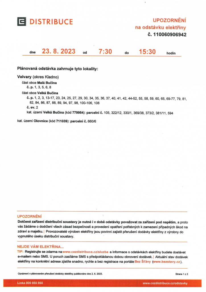 Oznamujeme plánované přerušení dodávky elektrické energie, které proběhne dne 23.8.2023 od 7:30 do 15:30 hodin v částech obcí Malá a Velká Bučina.
