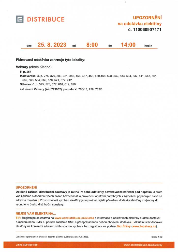 Oznamujeme plánované přerušení dodávky elektrické energie, které proběhne dne 25.8.2023 od 8:00 do 14:00 hodin v ulici