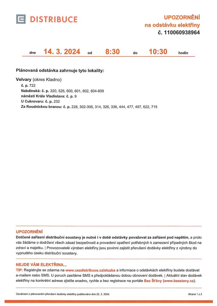 Plánovaná odstávka elektřiny 14.3.2024 od 8:30 do 10:30 hodin
