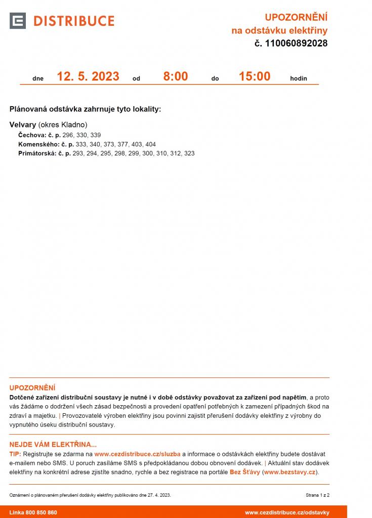 Jménem ČEZ Distribuce si dovolujeme informovat o plánovaném přerušení dodávky elektřiny 12. 5. 2023