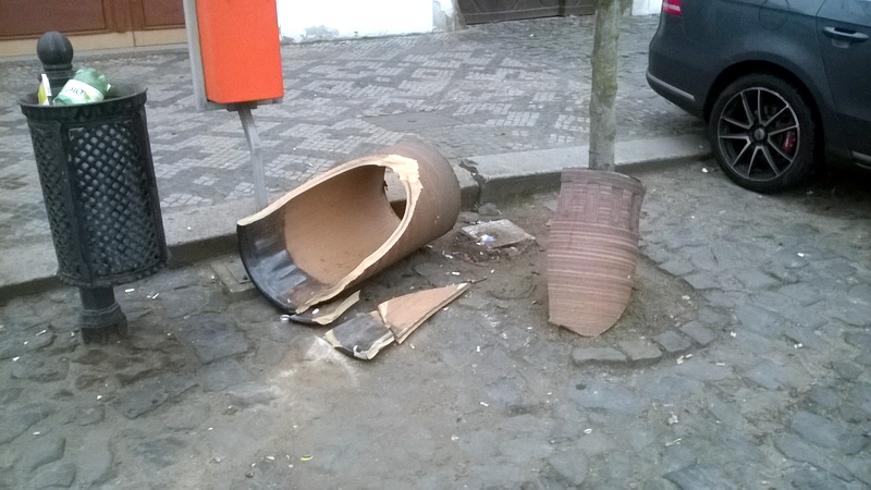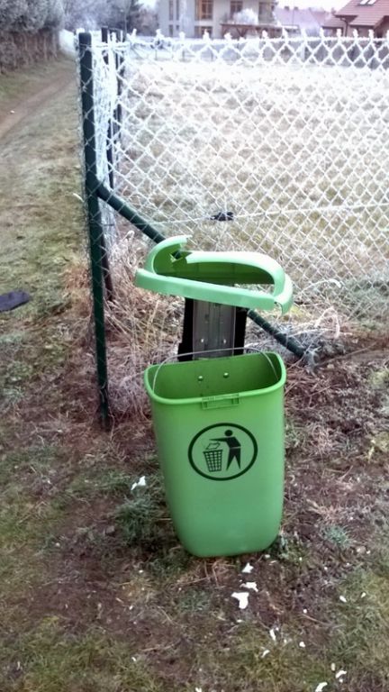 Na náměstí jsme našli rozbitý keramický koš před prodejnou potravin, dále bylo poškozeno cca 5 plastových odpadkových košů a to v parku za školou, podél cestičky od novinového stánku k MŠ a na dvou místech v Líse. Buď byly mechanicky poškozené nebo do nich někdo hodil pyrotechniku.