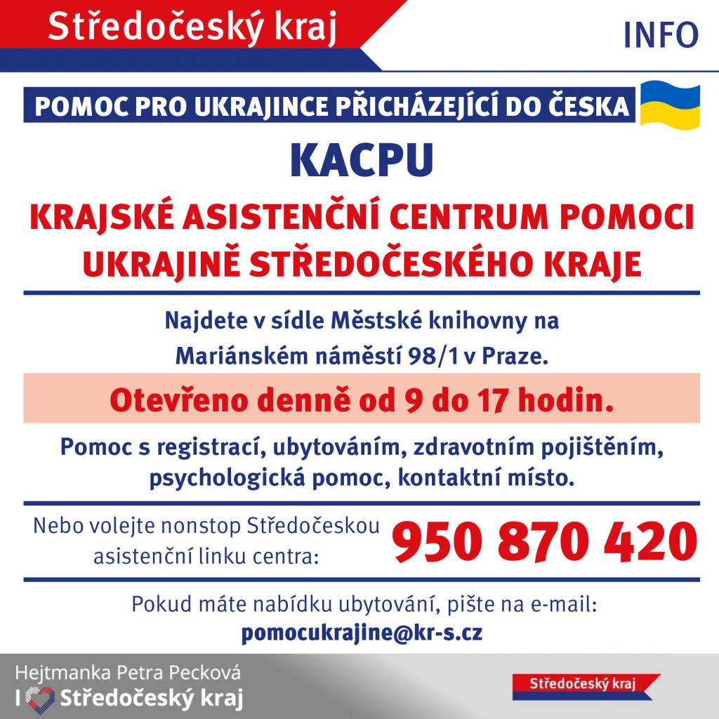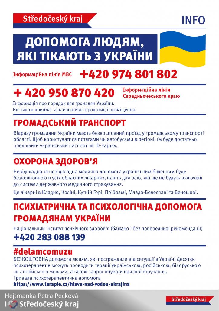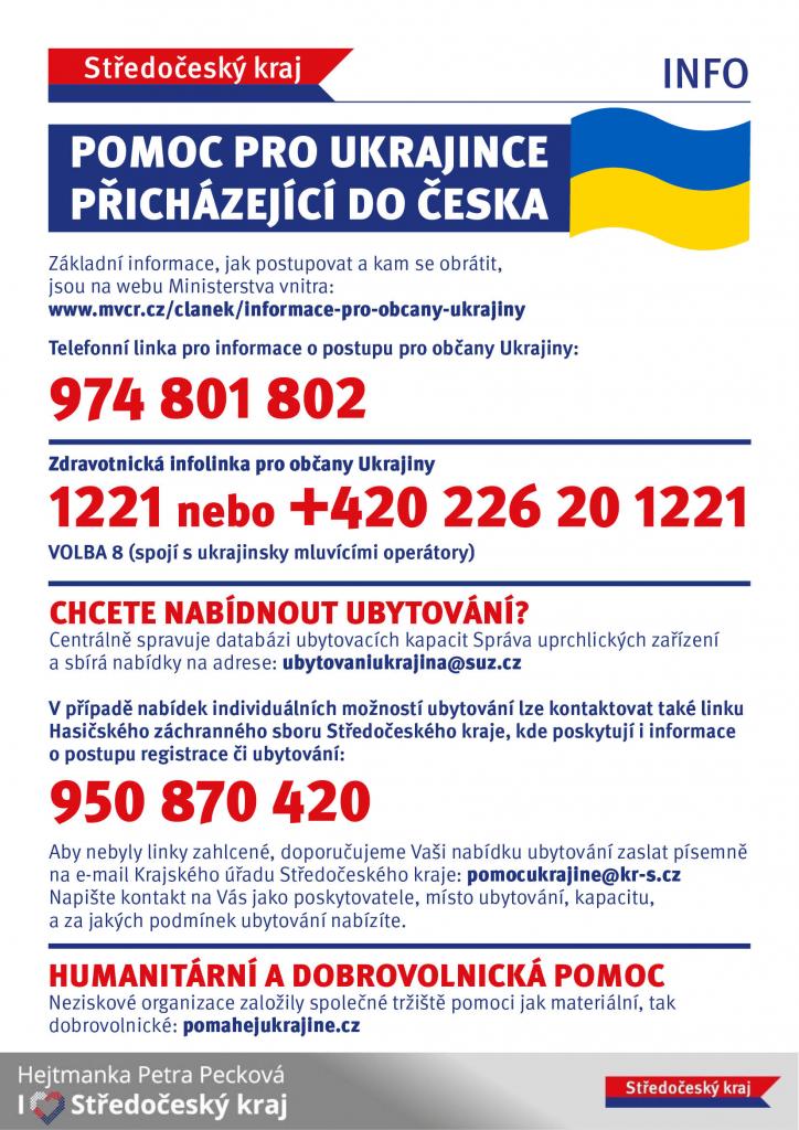 Ubytování - ve Velvarech už je ubytováno několik rodin, jde ve všech případech o maminky s dětmi. Děkujeme všem, kdož jste nabídli ubytování ve svých domovech, zatím se nám daří všechny zájemce velmi rychle umísťovat. Díky vyší rychlé pomoci v podobě daru nábytku jsme dokázali vybavit i další prostory, které nabízíme k ubytování. Pokud nabízíte ubytování ve Velvarech volejte starostu 606 66 88 01, registrujte se na www.pomahejukrajine.cz