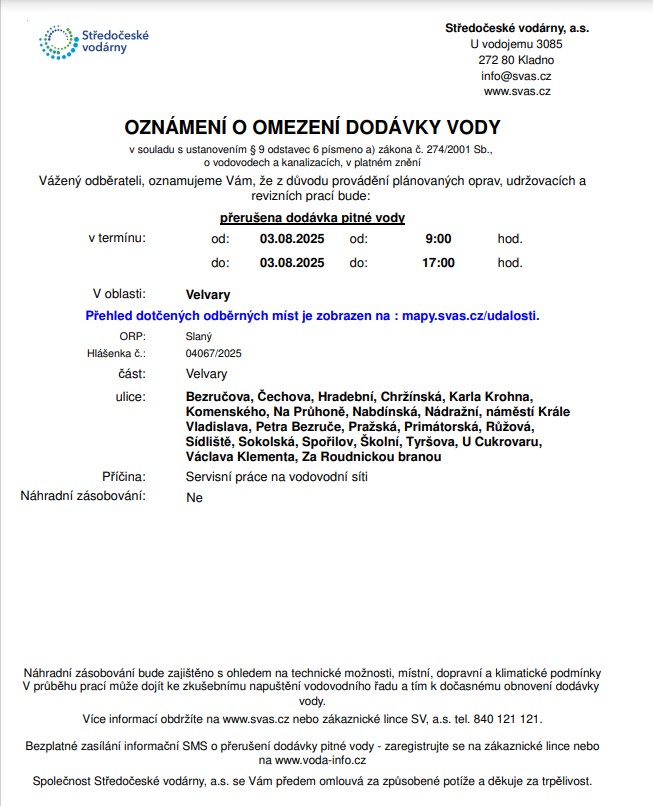 Středočeské vodárny oznamují omezení dodávky vody v neděli 3. 8. 2025