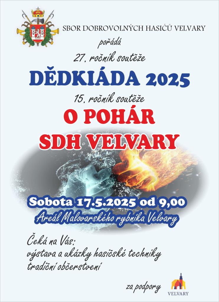 Sbor dobrovolných hasičů Velvary zve občany na 27.ročník hasičské soutěže Dědkiáda, který se koná v sobotu 17. května 2025 od 9.00 hodin v areálu Malovarského rybníku. Podrobnosti na přiloženém plakátku.
