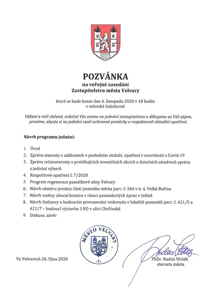 Pozvánka na jednání Zastupitelstva města Velvary 4. 11. 2020
