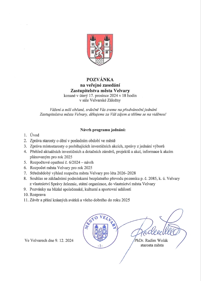Pozvánka na jednání Zastupitelstva města Velvary v úterý 17. 12. 2024 od 18:00