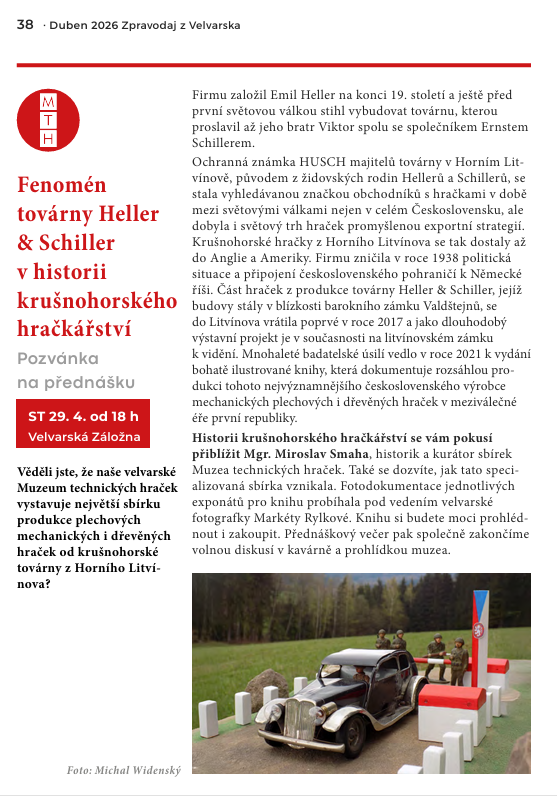 Pozvánka na přednášku: Fenomén továrny Heller & Schiller v historii krušnohorského hračkářství, Velvarská Záložna - středa 29.4.2026 v 18 h.