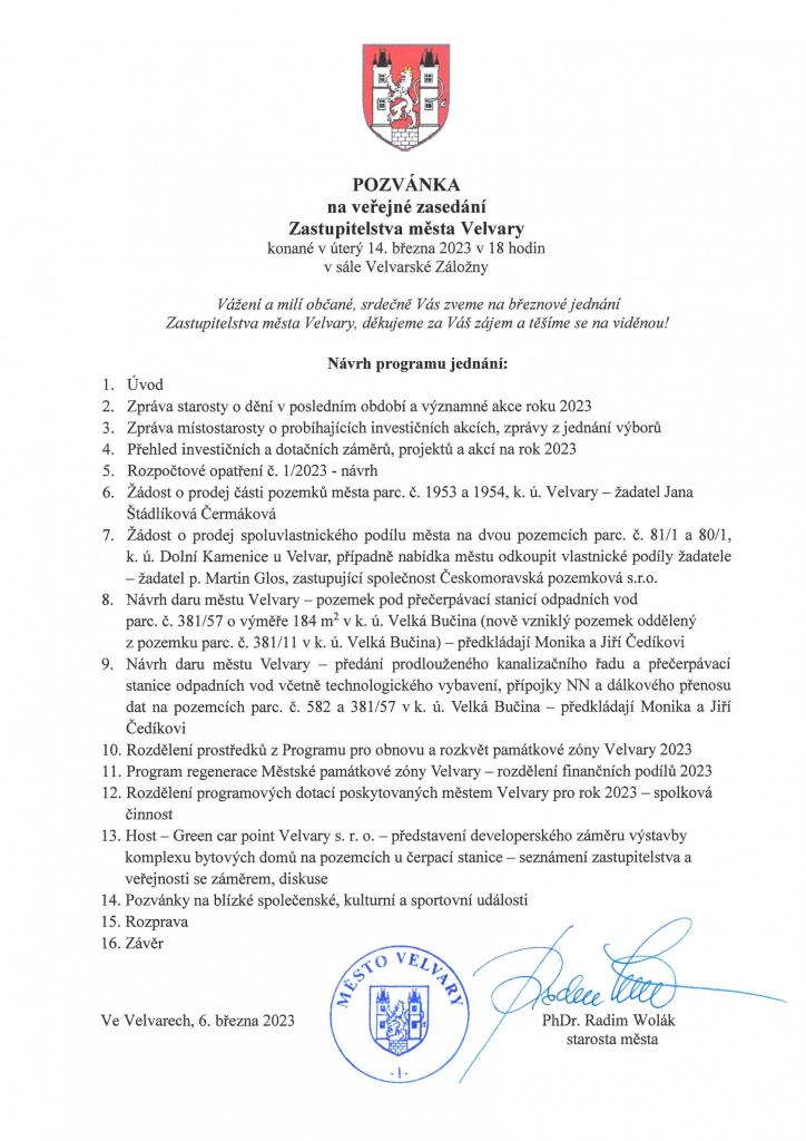 Pozvánka na zasedání Zastupitelstva města Velvary 14. 3. 2023