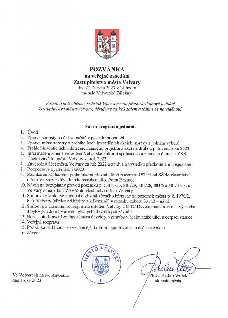 Pozvánka na zasedání Zastupitelstva města Velvary 21. 6. 2023