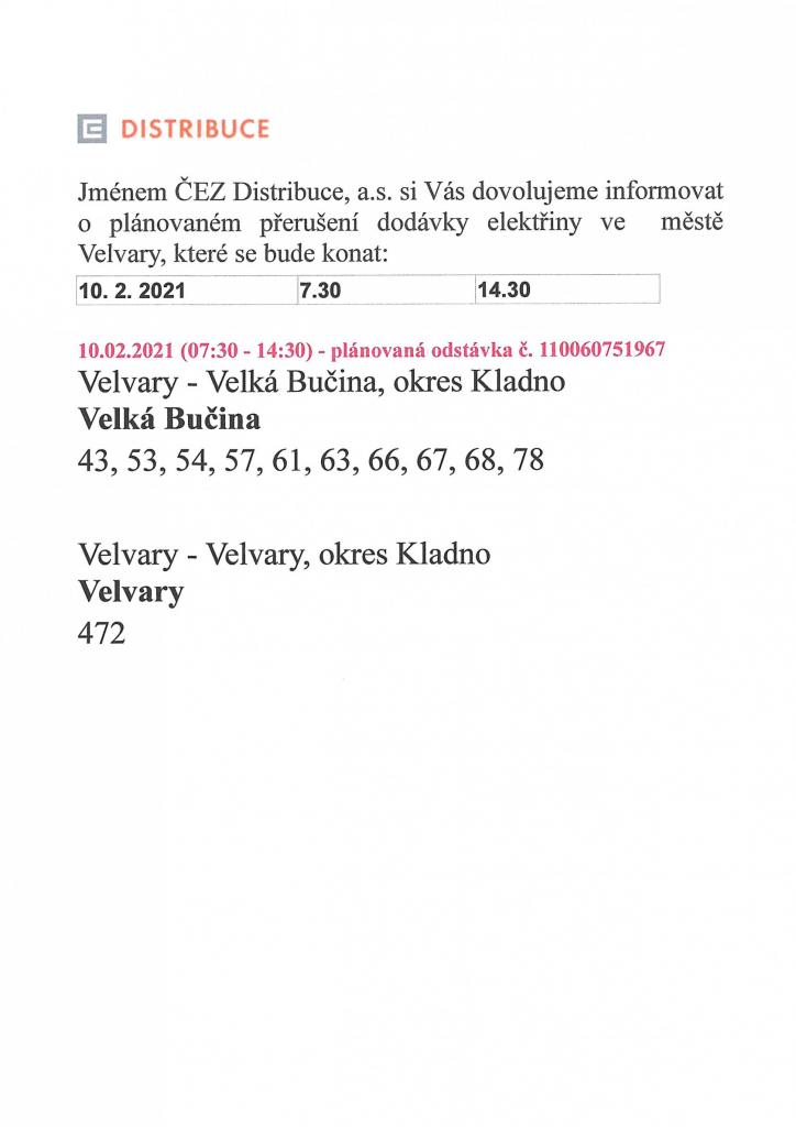 Jménem ČEZ Distribuce, a. s. si dovolujeme informovat o plánovém přerušení dodávky elektřiny na Velké Bučině 10. 2. 2021 od 7.30 do 14.30
