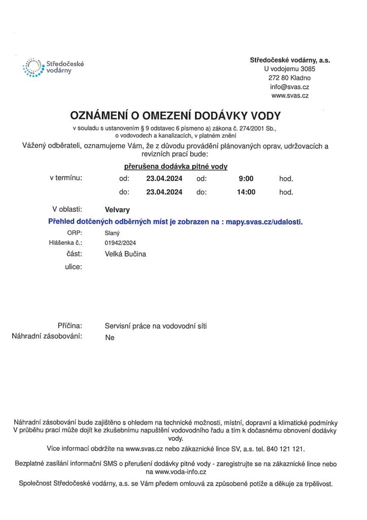 Přerušení dodávky pitné vody - VELKÁ BUČINA