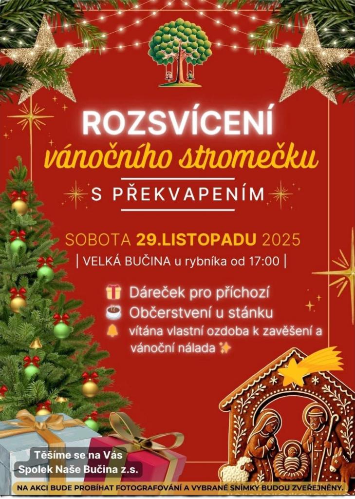 V sobotu 29. 11. od 17 h jste srdečně zváni na slavnostní Rozsvícení vánočního stromečku u rybníka na Velké Bučině. Pořádá spolek Naše Bučina, z. s.