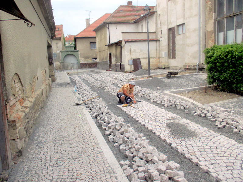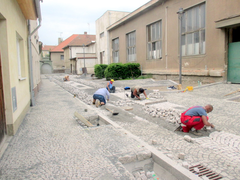 Další fotografie z pokračující rekonstrukce Růžové ulice, pokládkou dlažby již dostává ulice novou tvář...