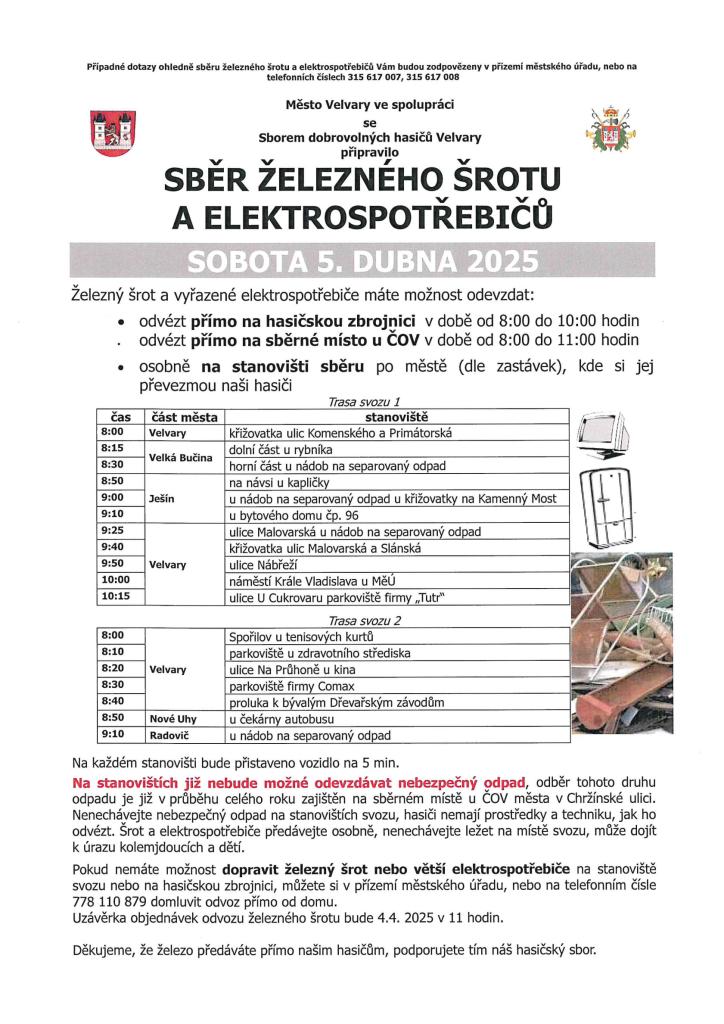 Město Velvary ve spolupráci s SDH Velvary připravilo na sobotu 5.4.2025 již tradiční sběr železného šrotu a elektrospotřebičů.