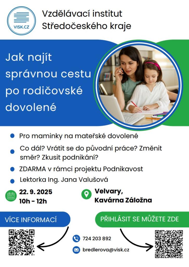 Vzdělávací institut Středočeského kraje oznamuje zrušení semináře "Jak najít správnou cestu po rodičovské dovolené", který se měl konat v pondělí 22.9.2025 ve Velvarské Záložně. Důvodem je nízký zájem občanů.