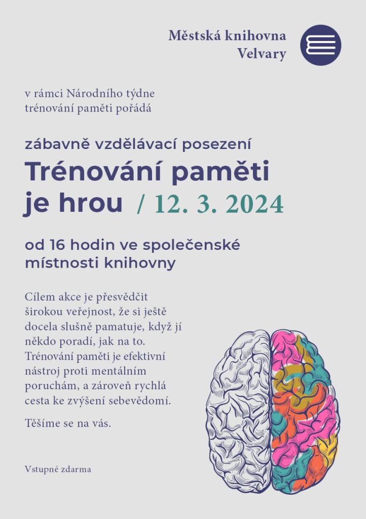 v úterý 12.3. srdečně zveme všechny zájemce, kteří se chtějí dozvědět více o tom, jak lze trénovat a zlepšovat paměť a zároveň váhají s přihlášením do kurzu. Každý je u nás v knihovně vítán!