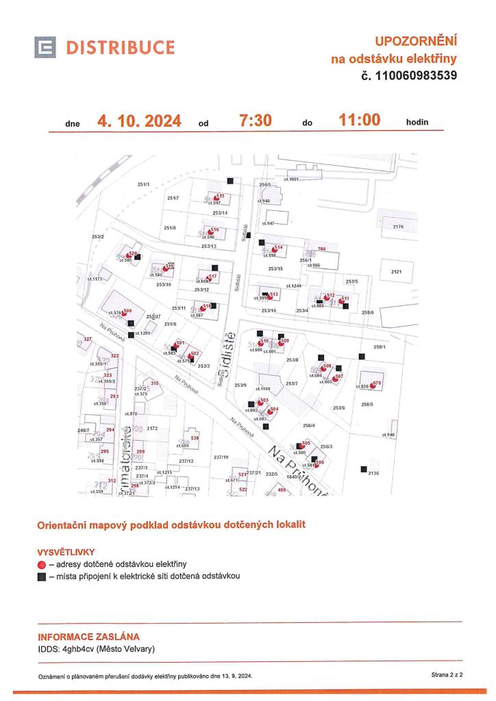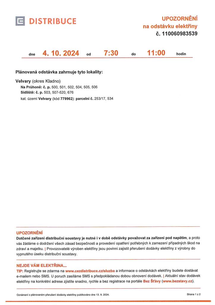 UPOZORNĚNÍ - ODSTÁVKA ELEKTŘINY 4.10.2024 7:30 - 11:00 HODIN