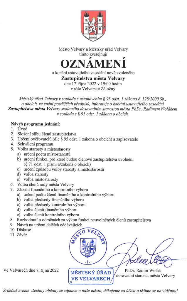 Srdečně Vás zveme na ustavují zasedání Zastupitelstva města Velvary do Velvarské Záložny v pondělí 17. 10. 2022