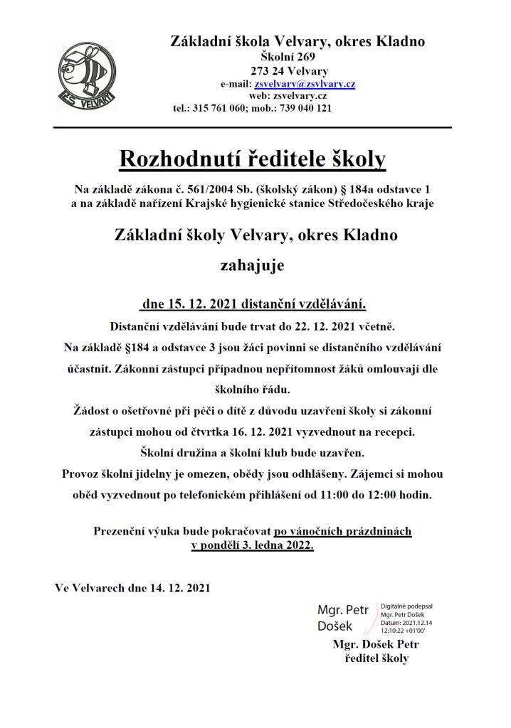 UZAVŘENÍ ZÁKLADNÍ ŠKOLY VELVARY od středy 15. 12. 2021