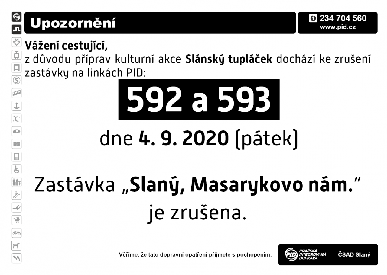 Integrovaná doprava Středočeského kraje informuje, že v pátek dne 4. 9. 2020 bude zrušena zastávka „Slaný, Masarykovo nám.“ z důvodu příprav kulturní akce Slánský tupláček