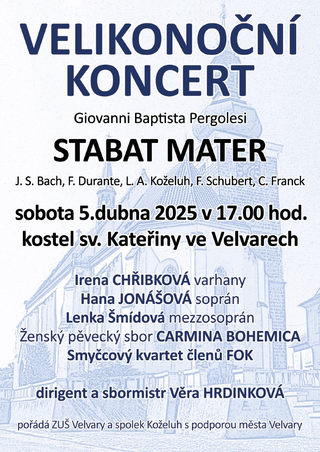 v kostele svaté Kateřiny ve Velvarech pořádá Základní umělecká škola Velvary a spolek Koželuh. Uslyšíte Pergolesiho Stabat Mater v podání pěveckého sboru Carmina Bohemica za doprovodu členů orchestru FOK.
