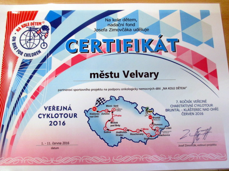 V Praze se k cyklistům  přidalo i 15 dětí z naší Základní školy včetně 3 dospělých osob, mezi kterými nechyběli starosta města Radim Wolák a ředitel školy Petr Došek. Ve Velvarech na náměstí na peleton čekalo vřelé přivítání a malé občerstvení, které připravily pracovnice městského úřadu. A právě město Velvary se stalo jedním z partnerů sportovního projektu, což bylo oceněno certifikátem.