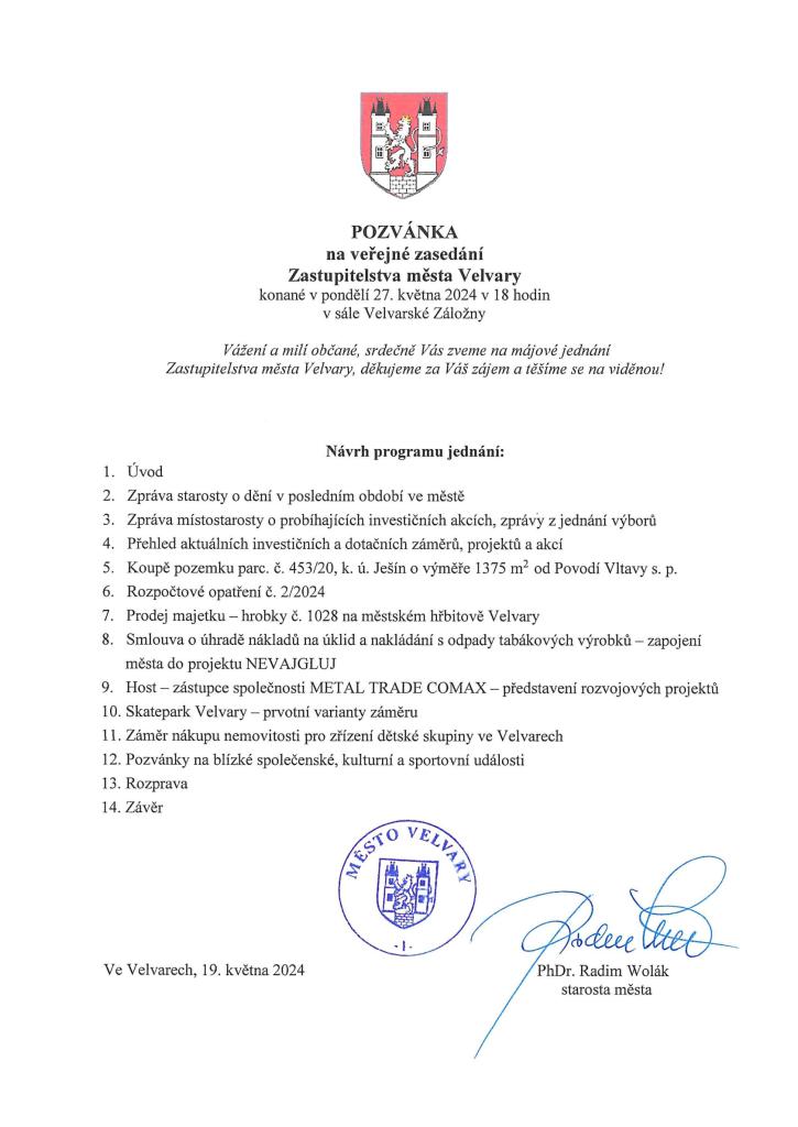 Veřejné zasedání Zastupitelstva města Velvary - v pondělí 27. 5. od 18 na Záložně