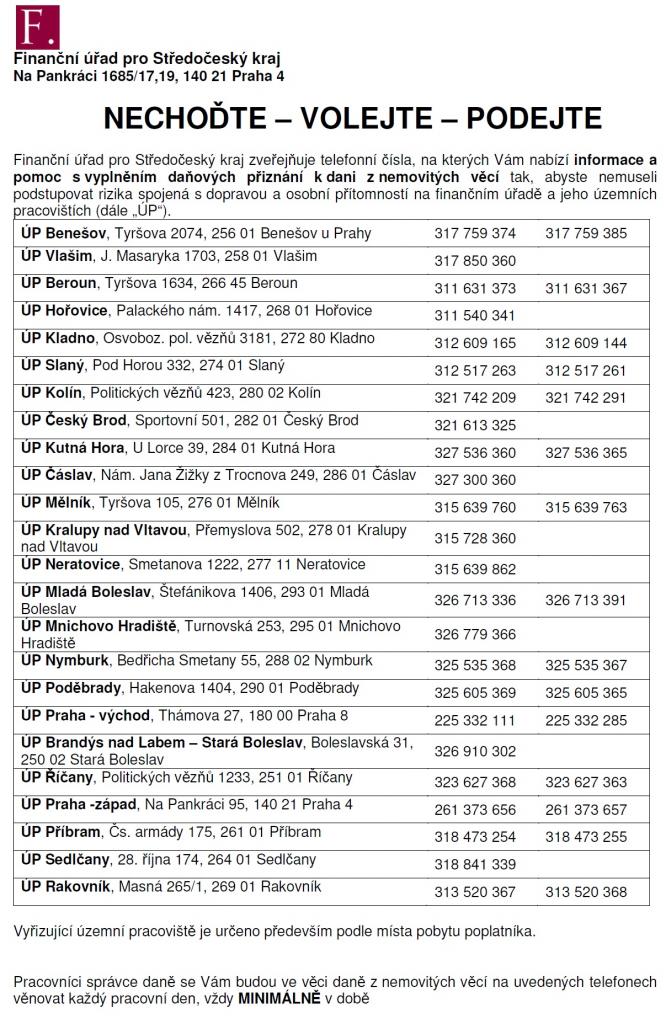 Finanční úřad pro Středočeský kraj si je vědom toho, že tato akce je každoročně spojená s kumulací poplatníků na podatelnách a také na odborných odděleních územních pracovišť Finančního úřadu pro Středočeský kraj.