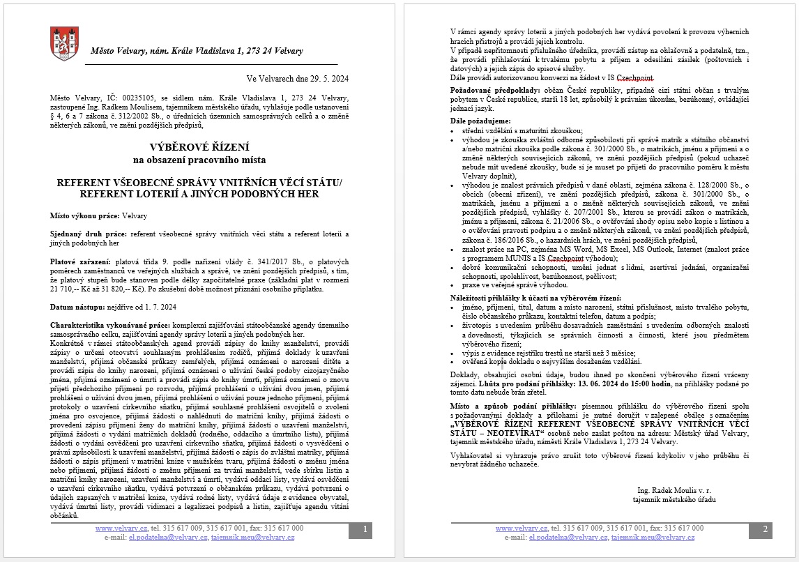 Lhůta pro podání přihlášek: 13.6.2024 do 15:00 hodin.