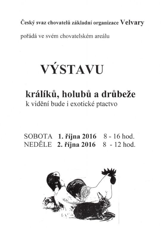 Český svaz chovatelů Velvary srdečně zve na tradiční podzimní výstavu holubů, králíků a drůbeže. K vidění bude také řada exotů. Výstava se koná ve dnech sobotu 1. října od 8 -16 hod a neděli 2 října od 8-12 hod.