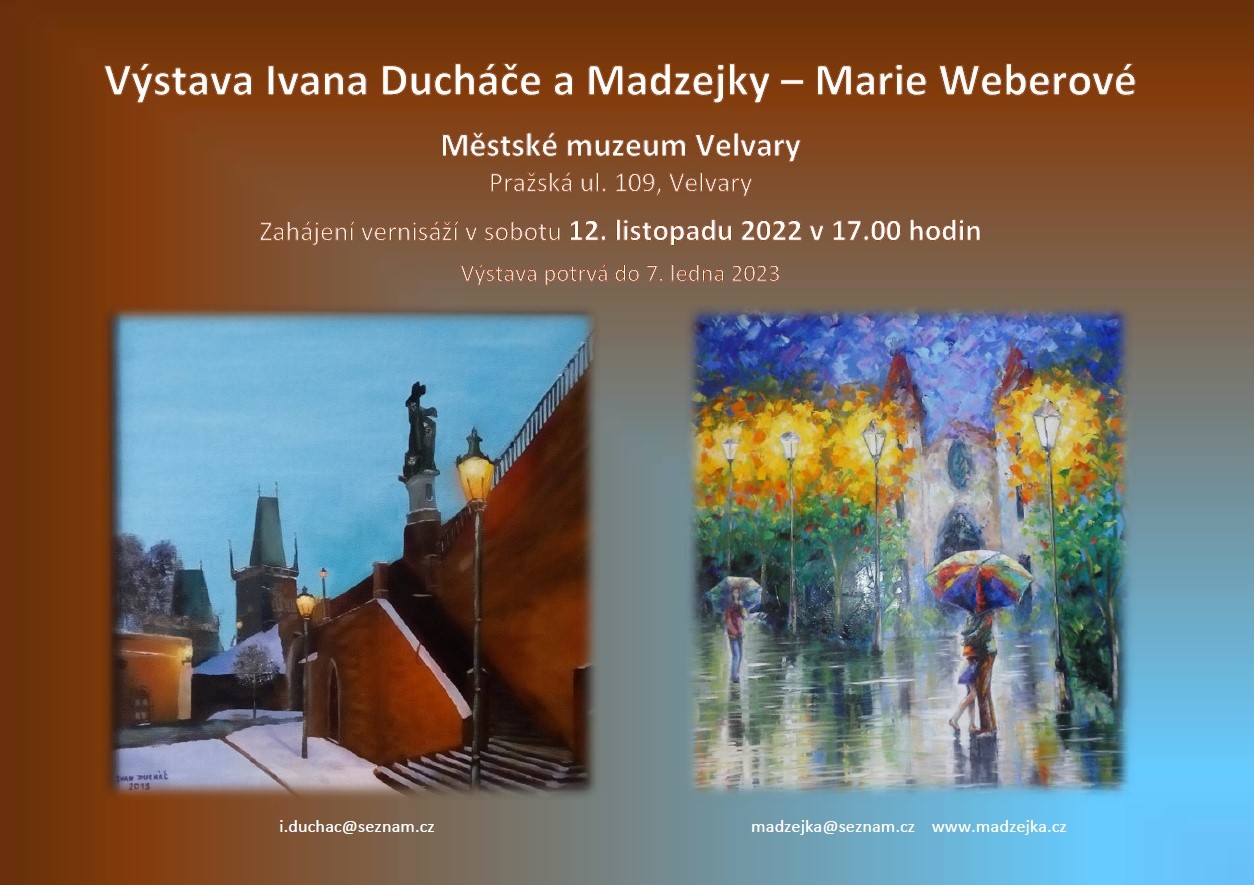 V sobotu 12. listopadu 2022 v 17.00 bude v muzejní galerii zahájena výstava obrazů Ivana Ducháče a Madzejky- Marie Weberové. Hudbou vernisáž doprovodí žáci ZUŠ ve Velvarech.